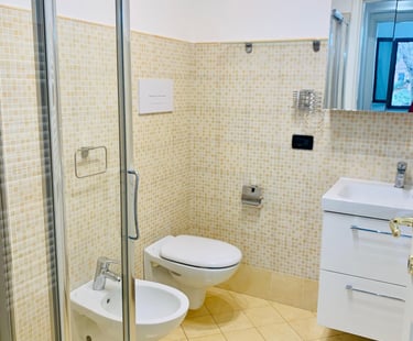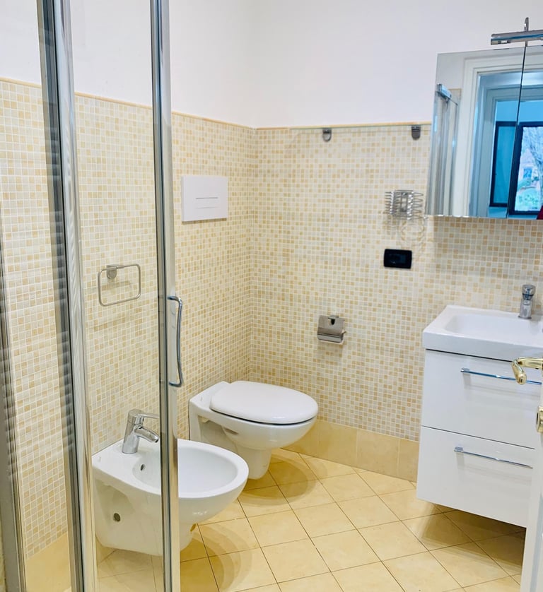 Bagno con box doccia completo di teli doccia, asciugamani, shampoo, bagnoschiuma, phon